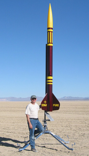 His craft, Space Death, an 11 foot tall, 8" diameter, screaming yellow sportster of a rocket, will be powered by a central M1315.