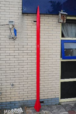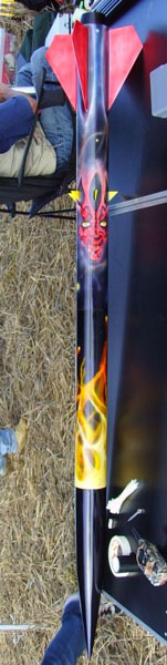 Altitude: 5000 feet Motor: contrail L 2525 Project Goal: This rocket was first launched at the Dairy Aire launch in '06. Originally finished in monokote, Solar storm has been refinished in Black and purple automotive finish. Solar Storm is over 13 feet tall and weighs over fifty pounds loaded. The first flight reached over 3500 feet, this time I am hoping to get closer to the Rocksim prediction of 5k.